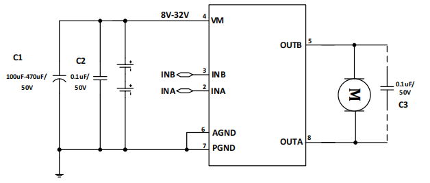 该产品采用 H 桥电路结构设计,采用高可靠性功率管工艺,特别适合驱动线圈、马达等感性负载。电路内部集成 N 沟道和 P 沟道功率 MOSFET,工作电压范围覆盖 8V到 32V。27℃,VM=24V条件下 SOP8封装最大持续输出电流达到 0.5A,最大峰值输出电流达到 2.0A。