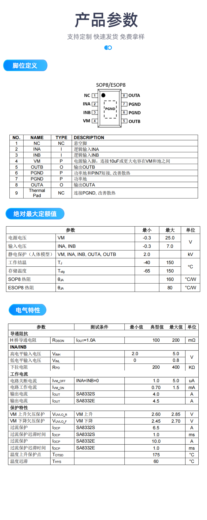 * SA8332S持续电流: 4.0A, 峰值: 6.5A